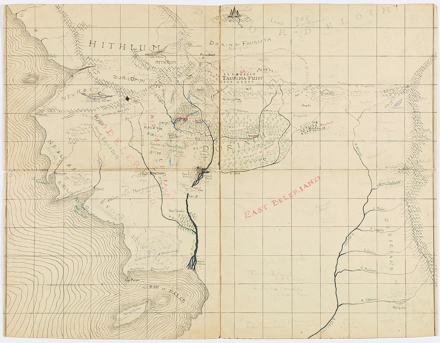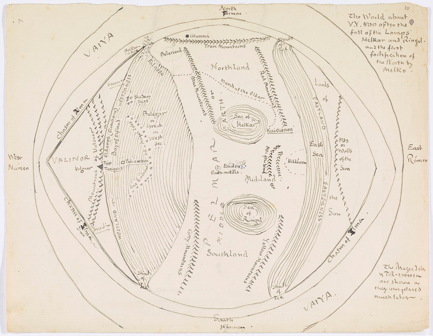 An early map drawn in 1930’s by Tolkien. This is, as is written in the margins, 500 years after the fall of the Lamps: Helkar and Ringil. Of course this would change as he would finish The Silmarillion.