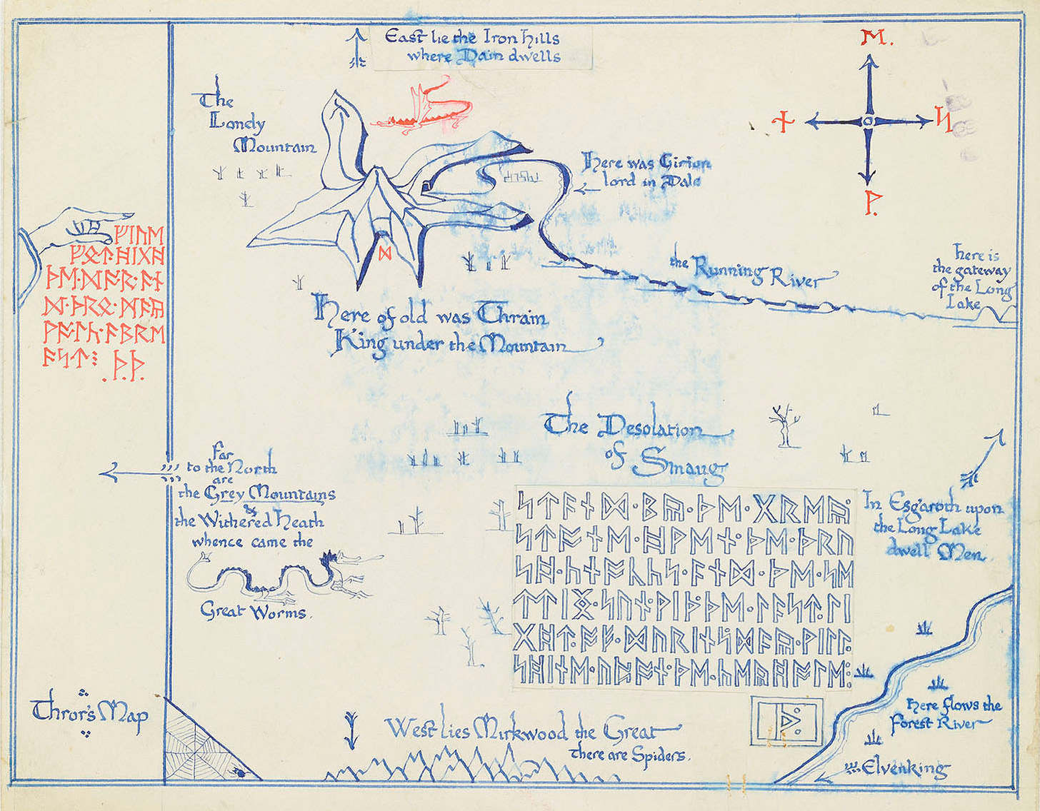 “Thror’s Map” drawn in 1930 for The Hobbit (with the pasted moon runes on the front).