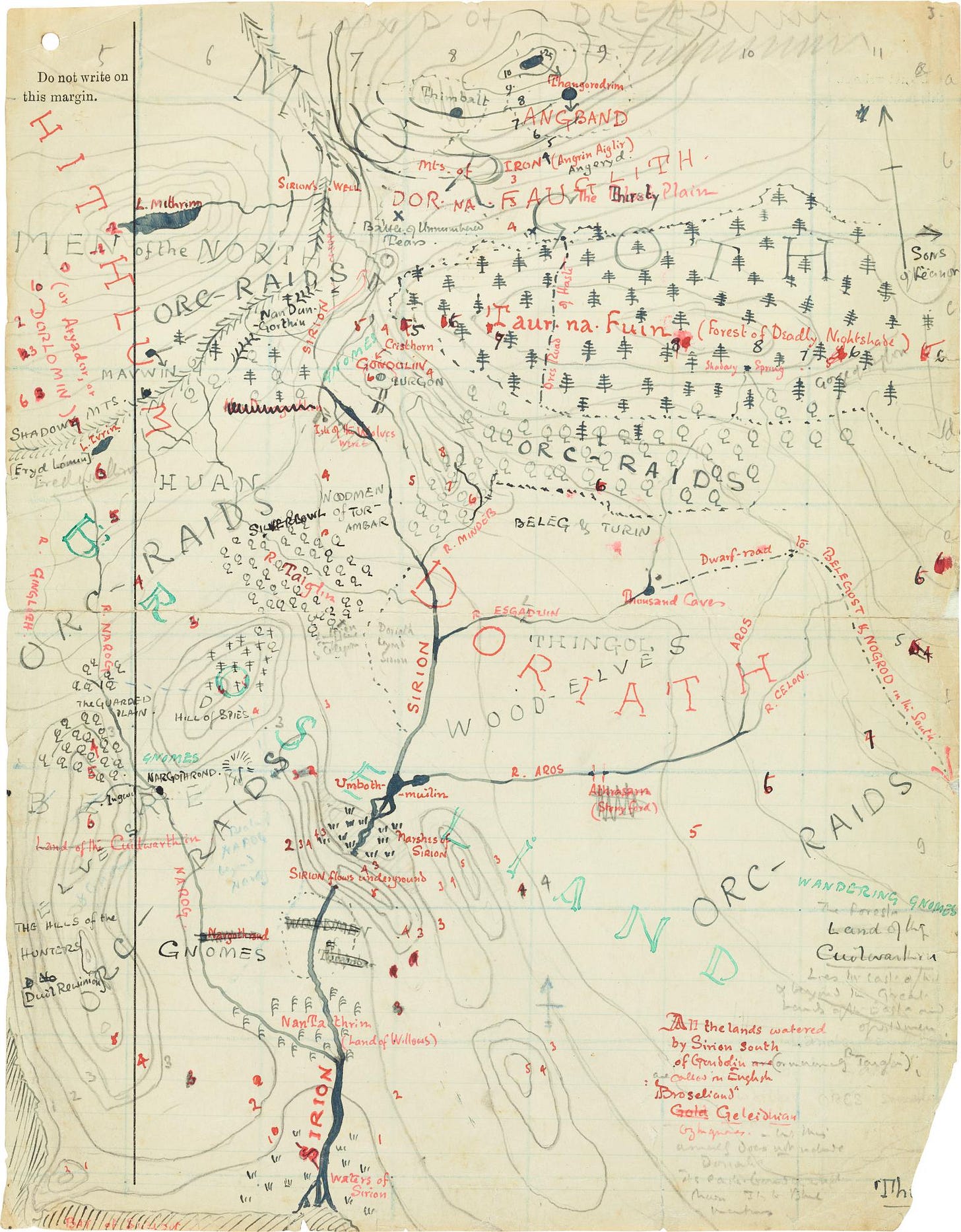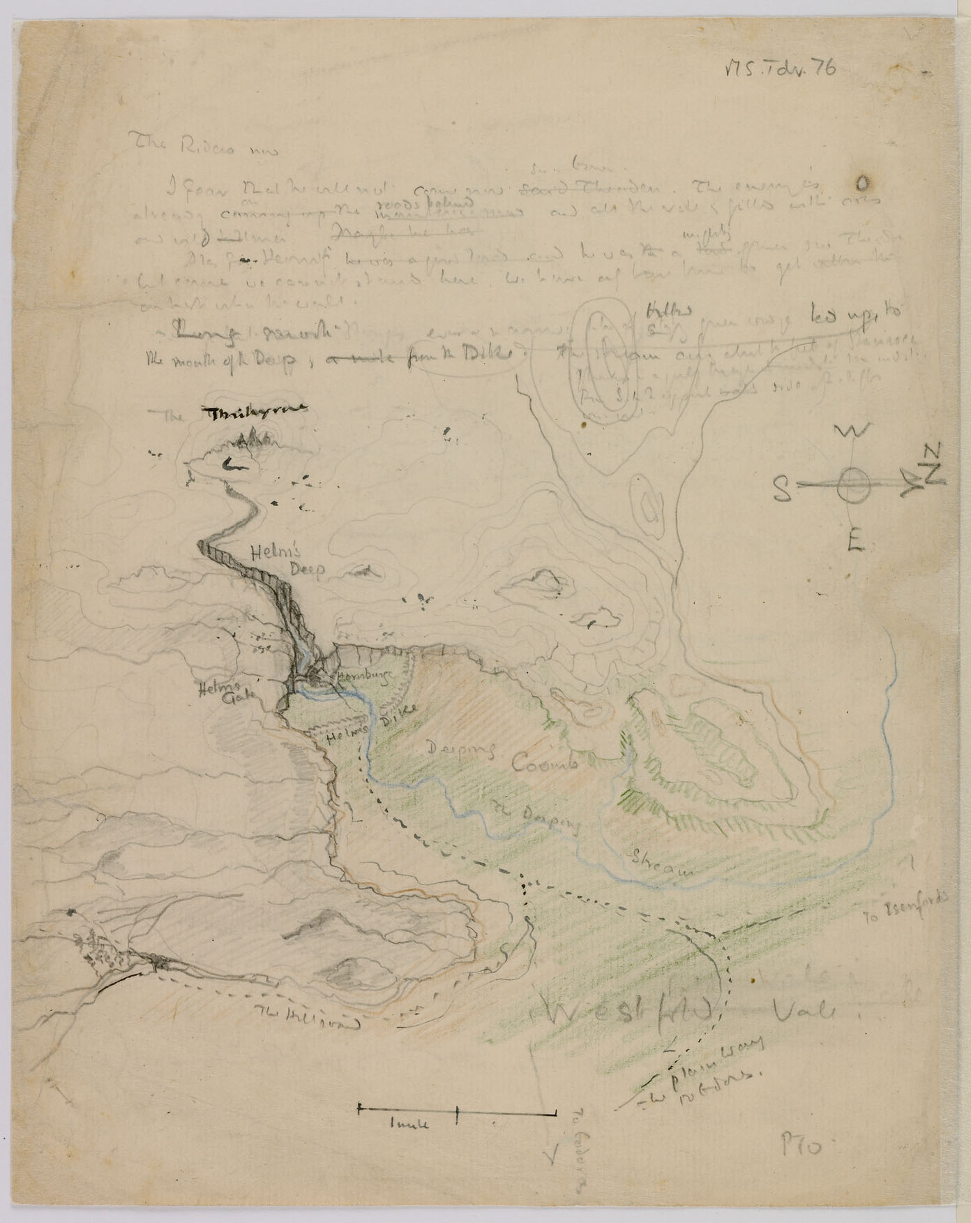 A unique view of Helm’s Deep. As you can see, this is why Tolkien’s descriptions of Middle-earth feel so real, he was dealing in a world with real geography. You can also notice some of his writing, as he is working out the story and plans on the same sheet.